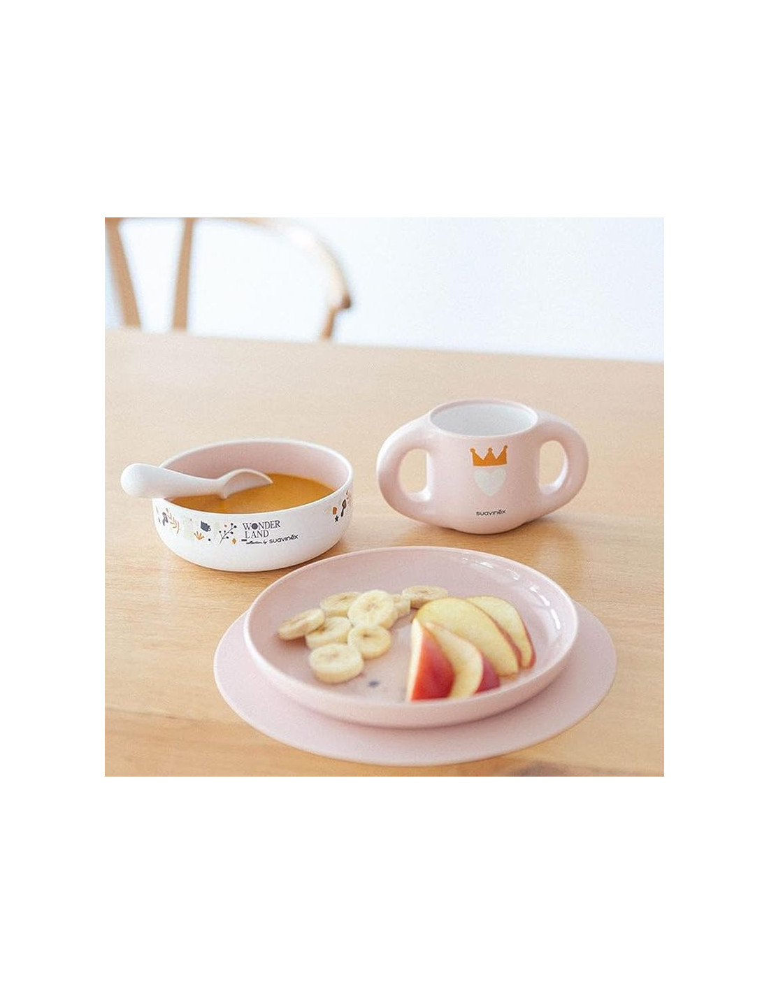 Piatto piano, piatto fondo, cucchiaino e tazza con manici