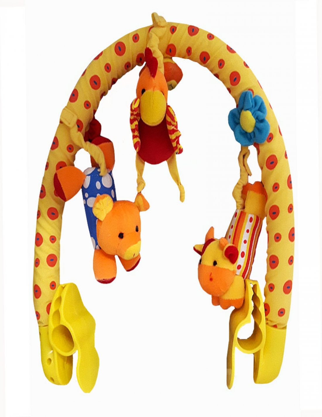 Giostrina colorata con animaletti in stoffe diverse. Grazie al movimento questi animaletti iniziano a suonare ed a incurosire il neonato al tatto e al suono. Composta da morsetti di plastica che permettono di poterla attaccare al passeggino, lettino e ovetto. 0+ mesi