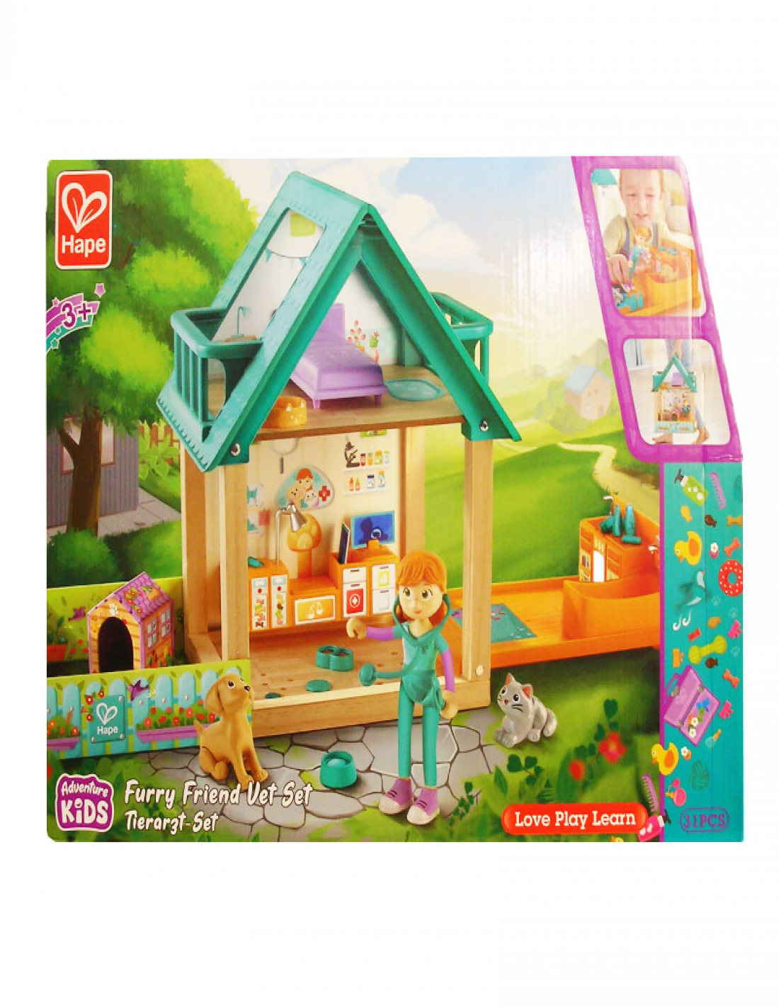 Una vera e propria clinica veterinaria con tutto il necessario per curare i tuoi amici a 4 zampe: lettino per le visite, giardinetto con cuccia, spazio toelettatura.. e poi la bravissima veterinaria Vera con i suoi due animaletti. 3+ anni